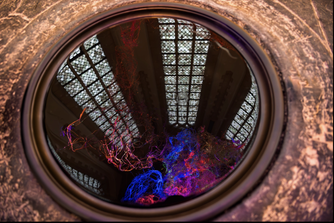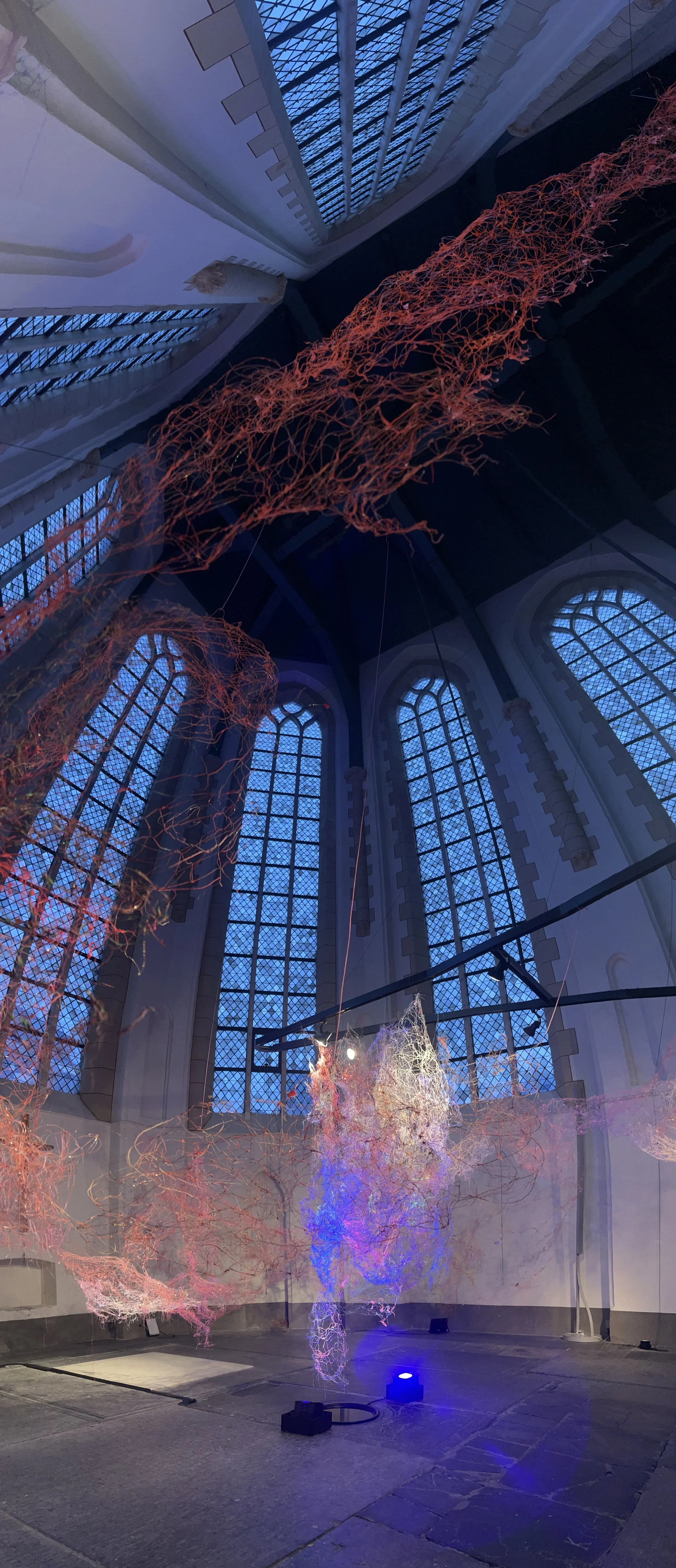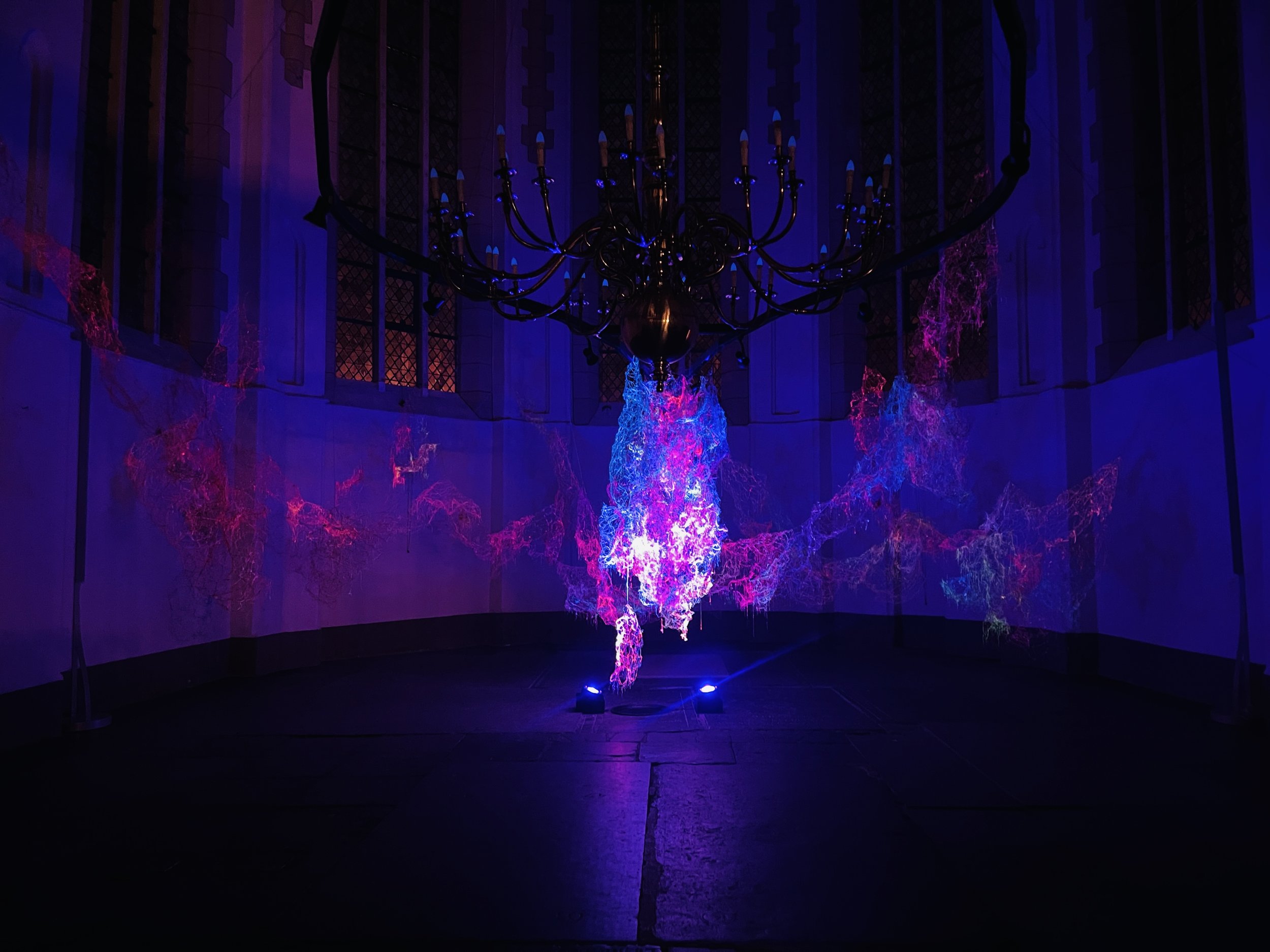 textile / metal wire, acrylic paint, reflective pigment, soundscape,(UV) light