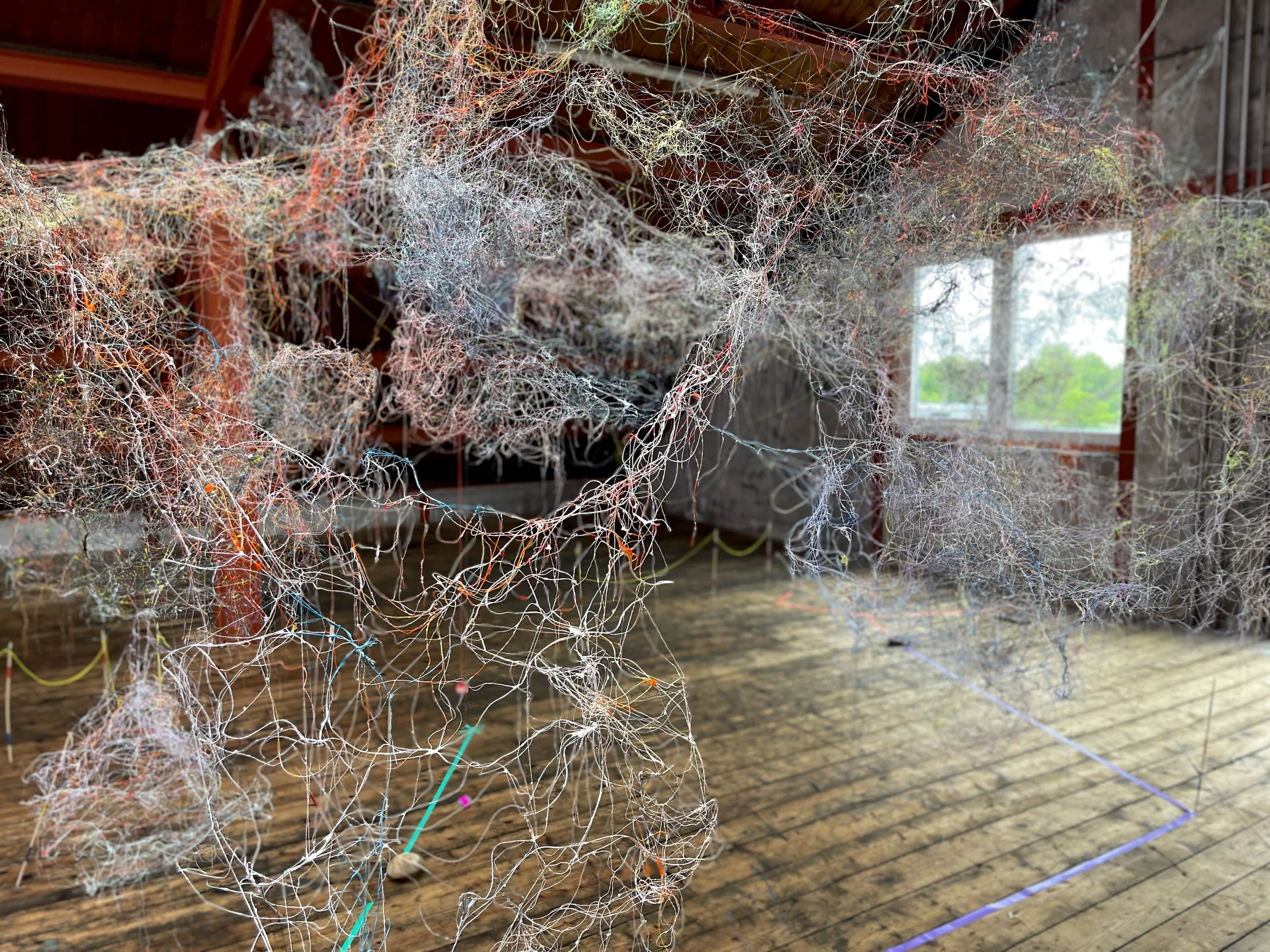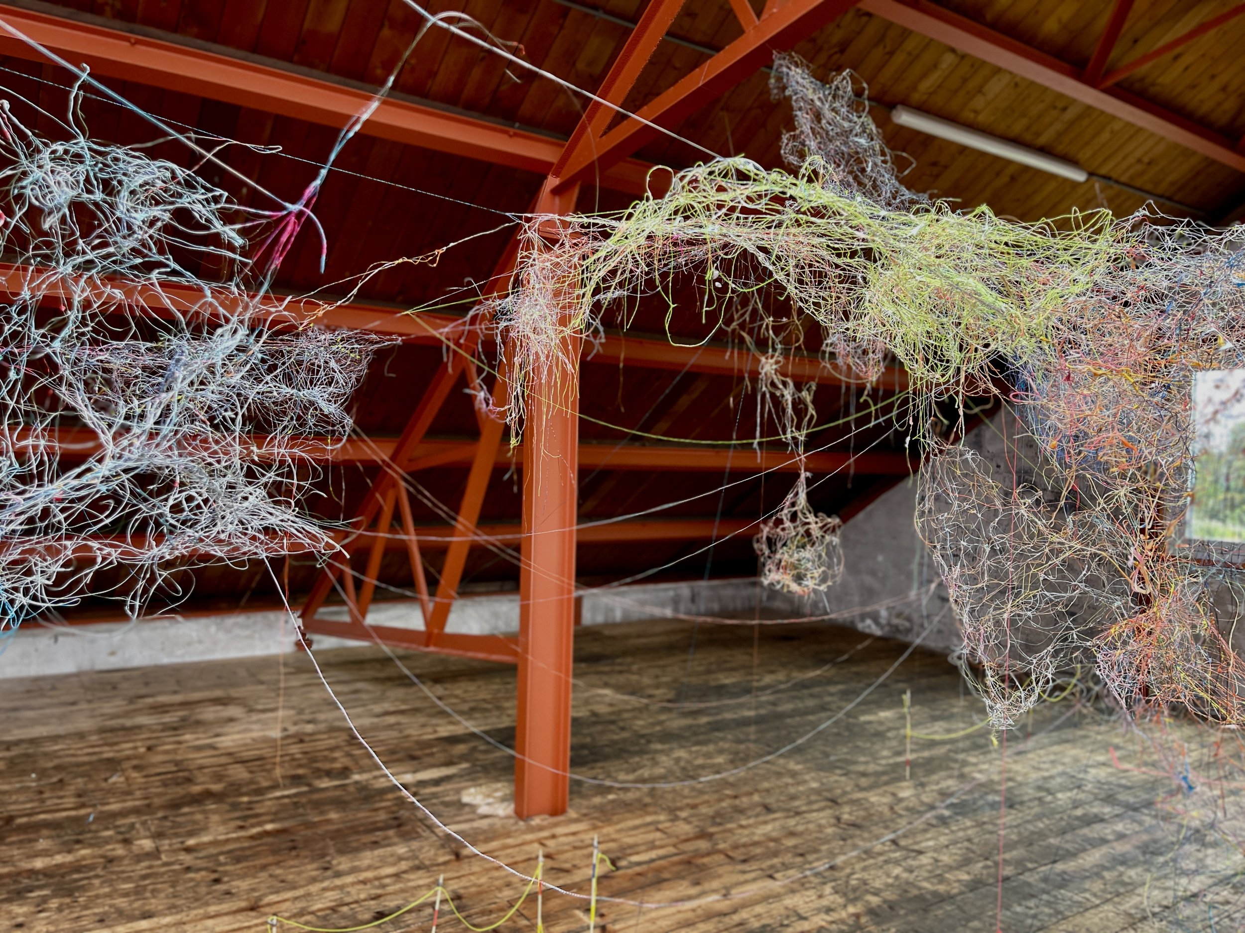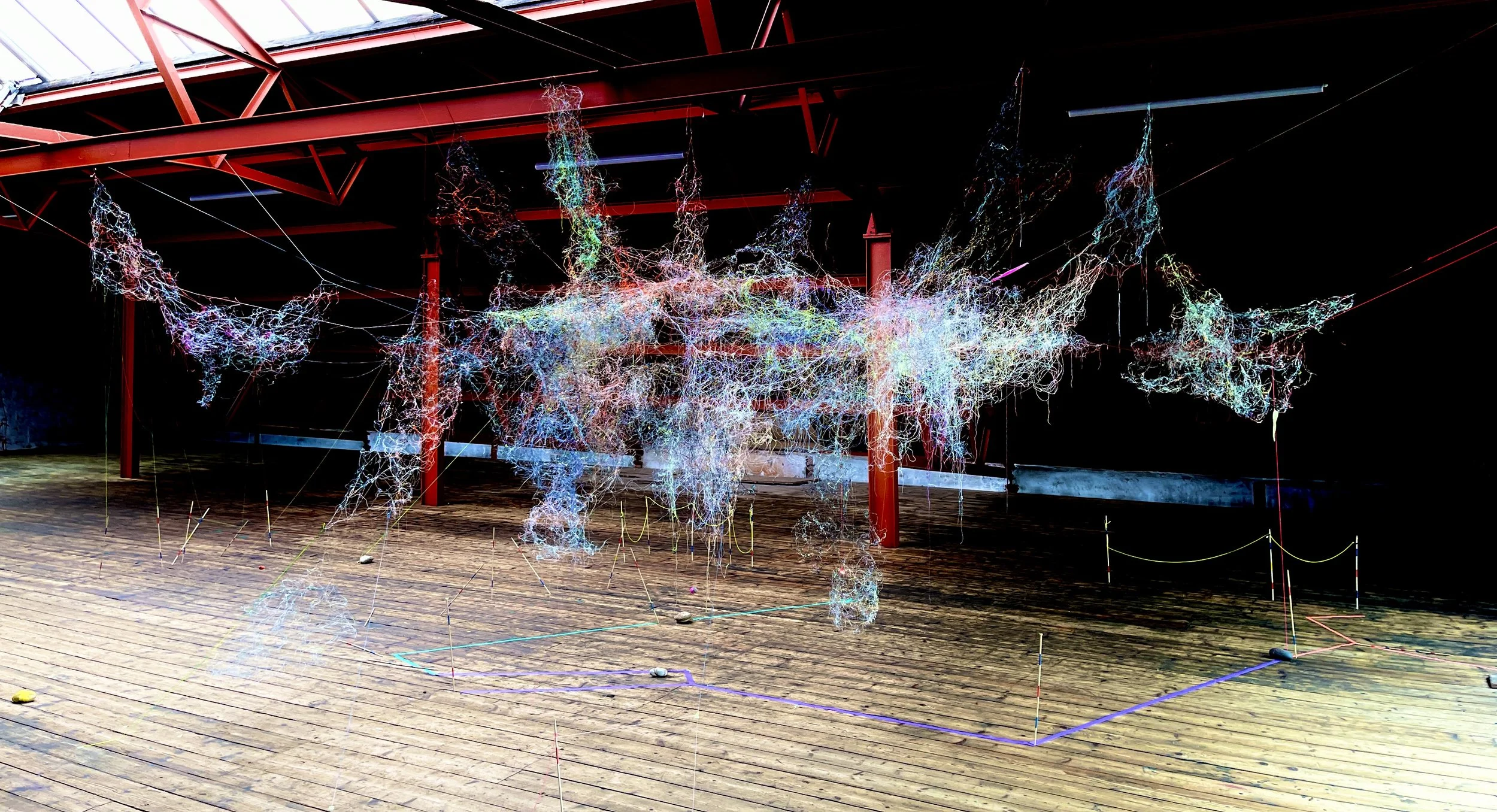 ‘ODE_(KAIROS#5)Year: 2023Material: textile / metal wire, acrylic paint, reflective pigment, stones, tape, mikados, pathwaysDimension: variable, approx. 8m x 10m