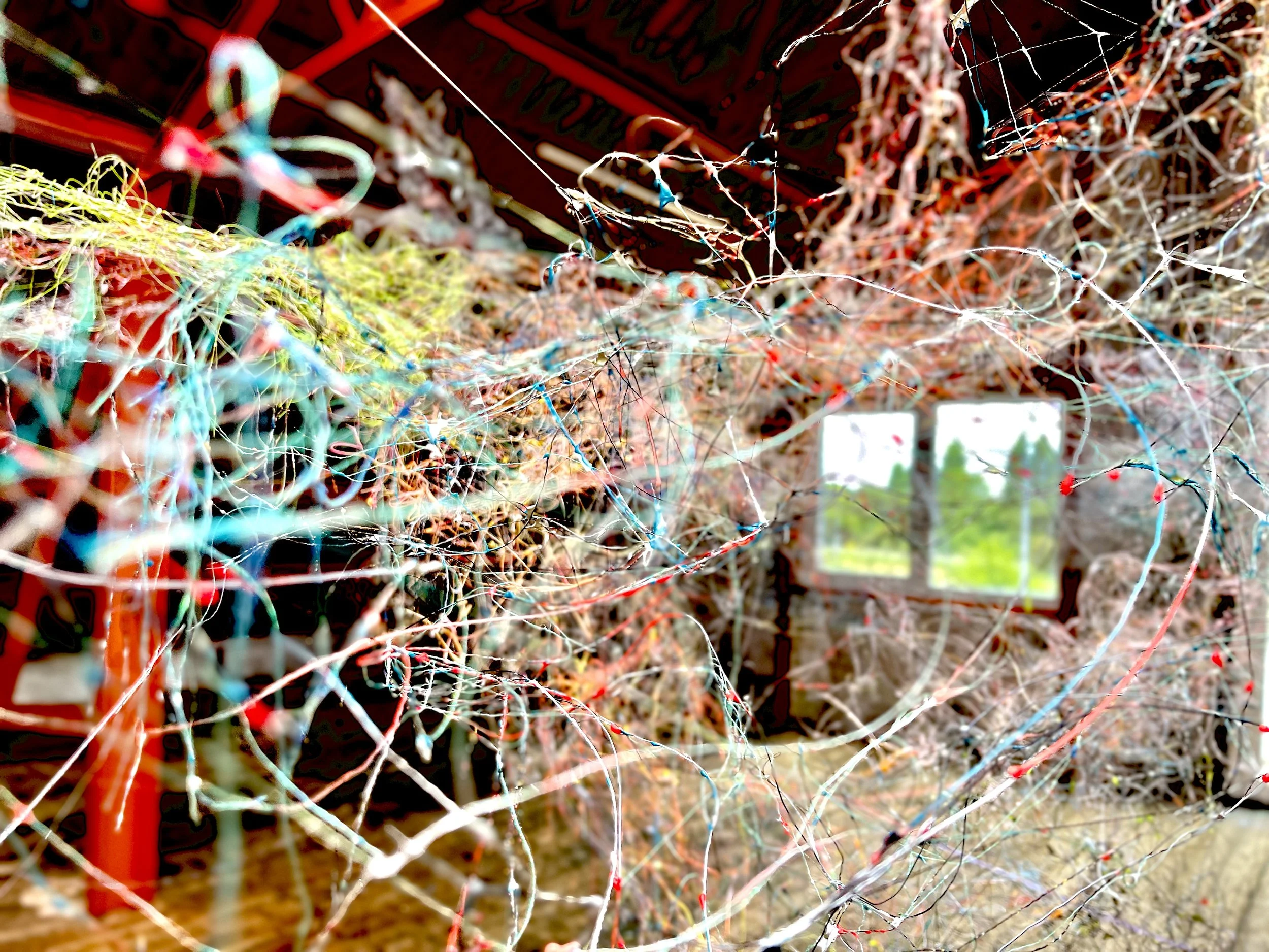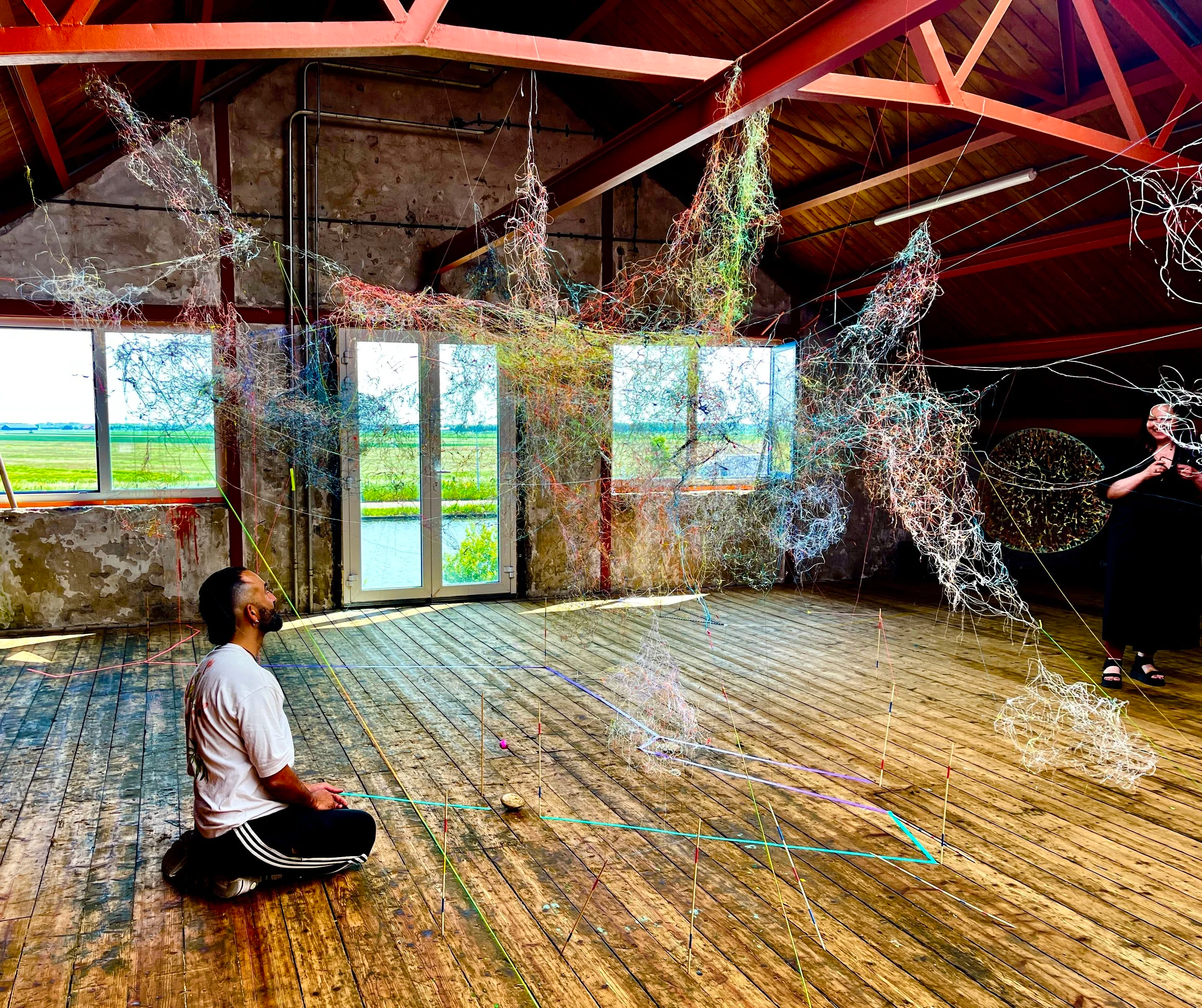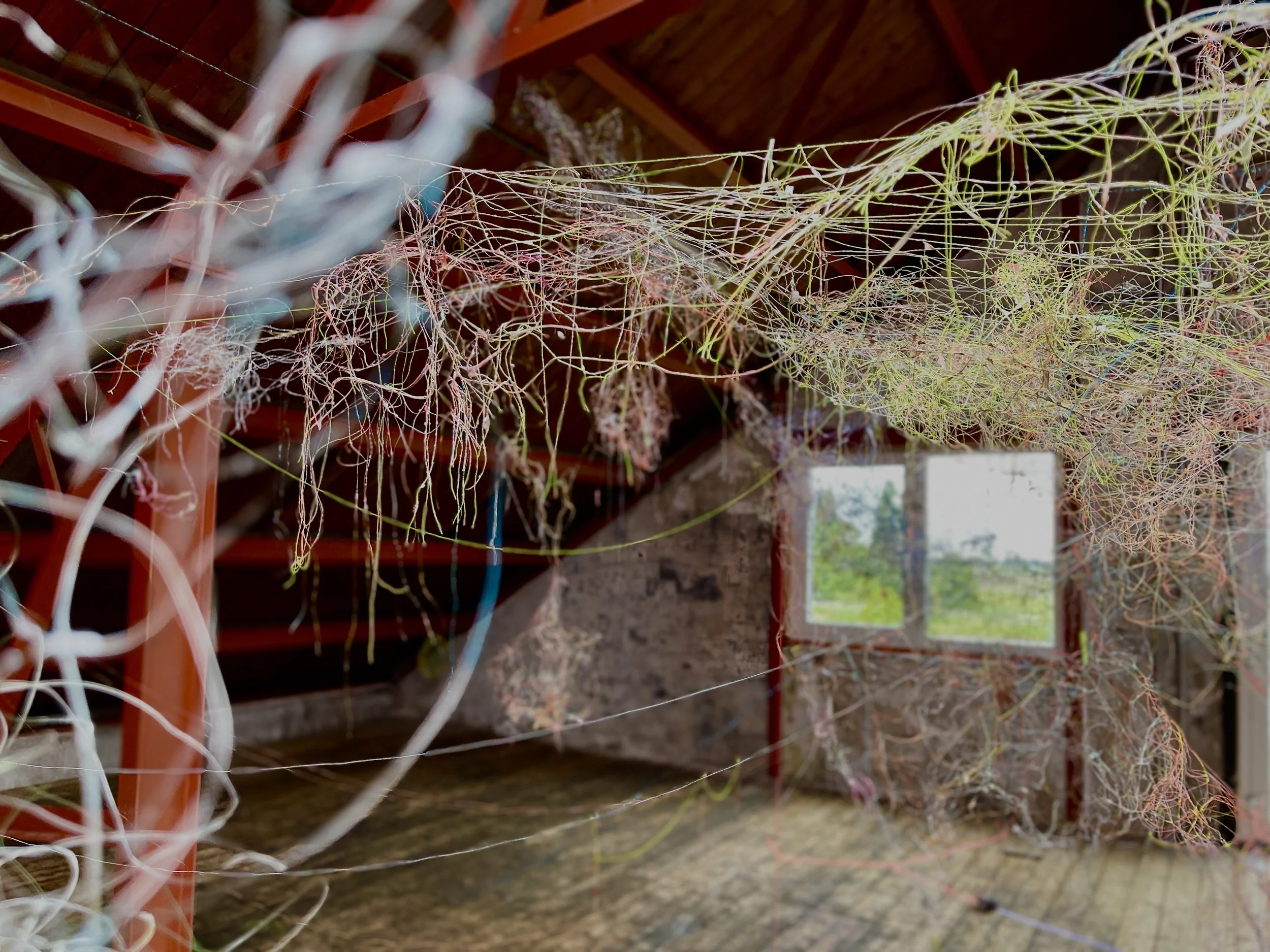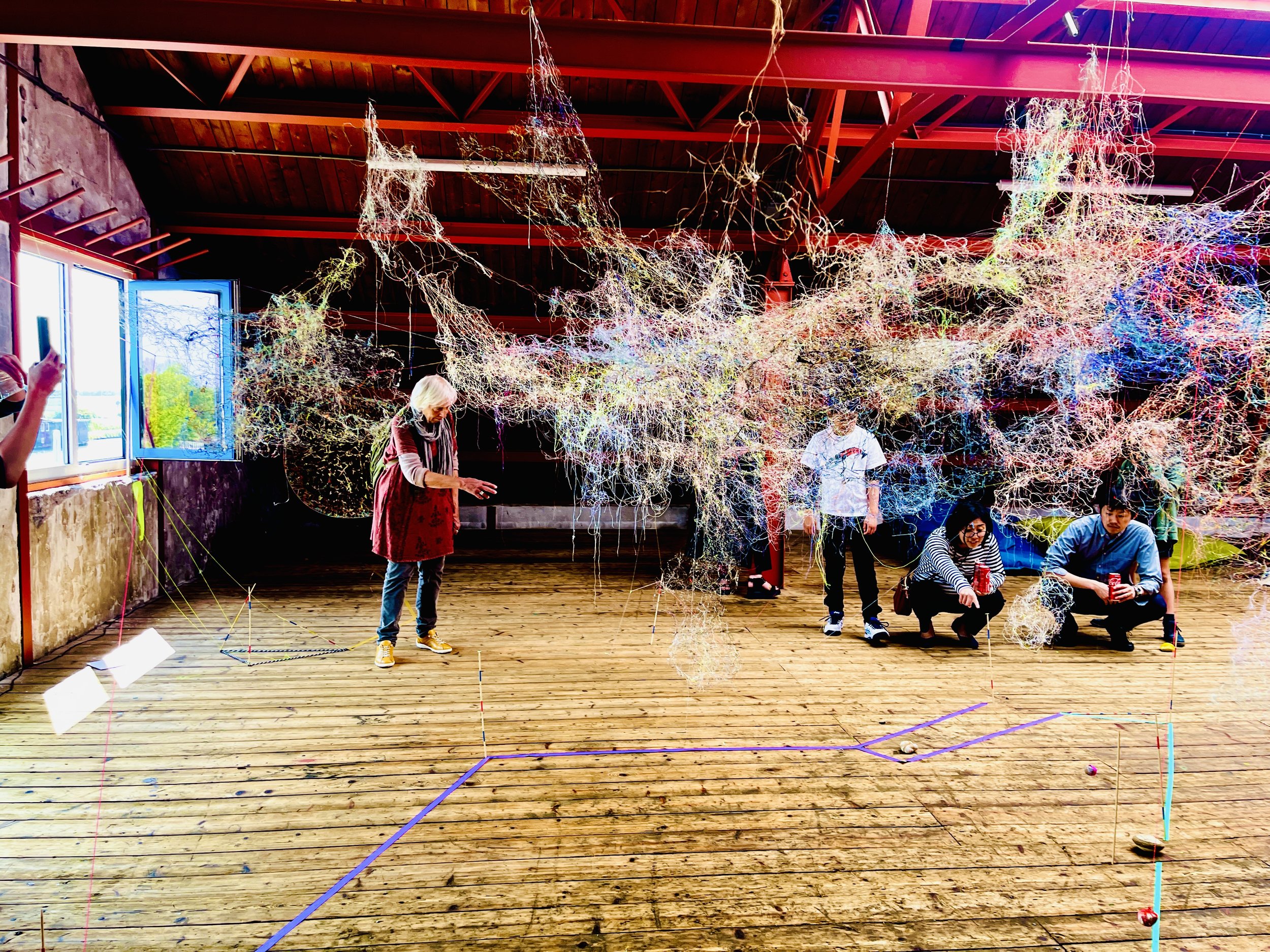 ‘ODE_(KAIROS#5)Year: 2023Material: textile / metal wire, acrylic paint, reflective pigment, stones, tape, mikados, pathwaysDimension: variable, approx. 8m x 10m
