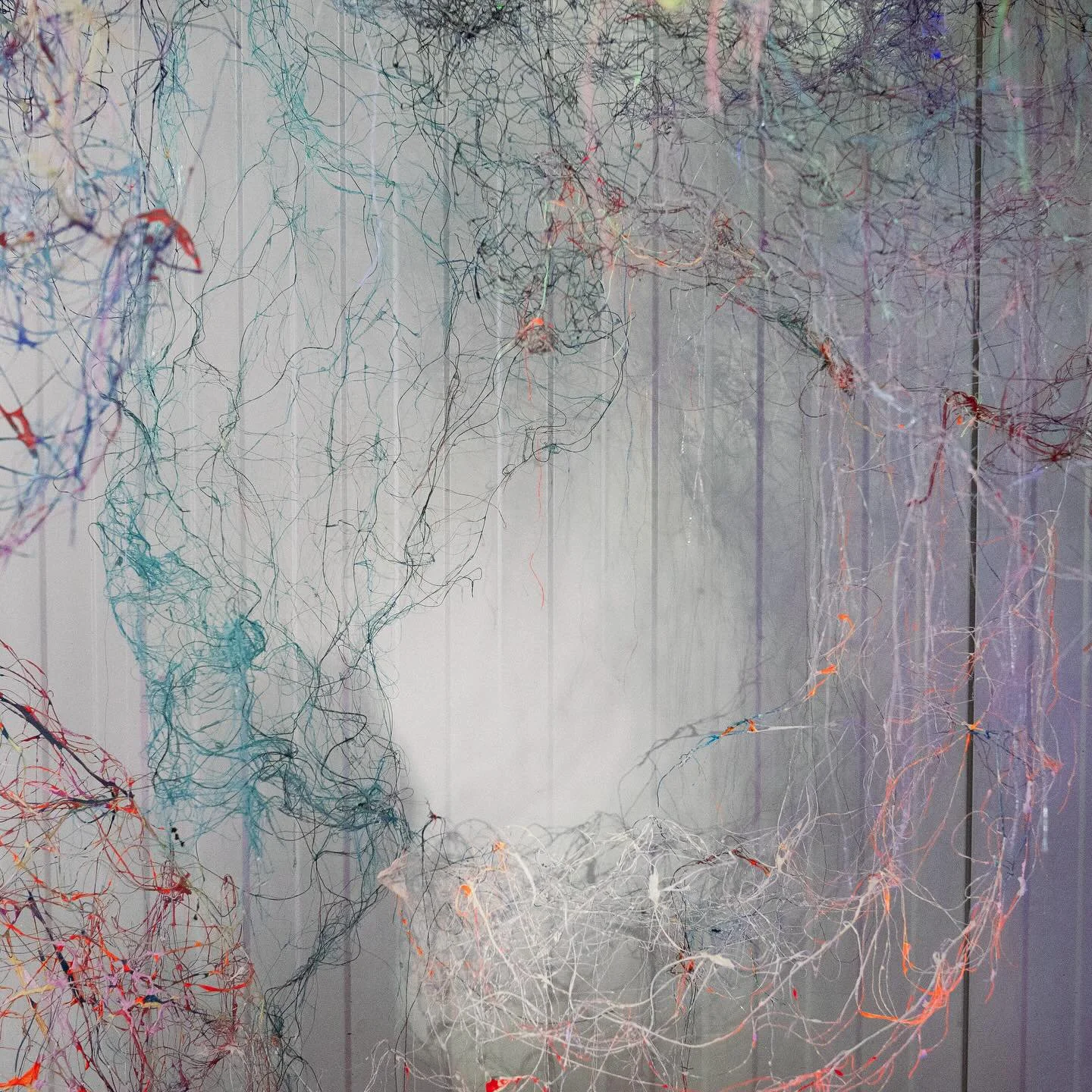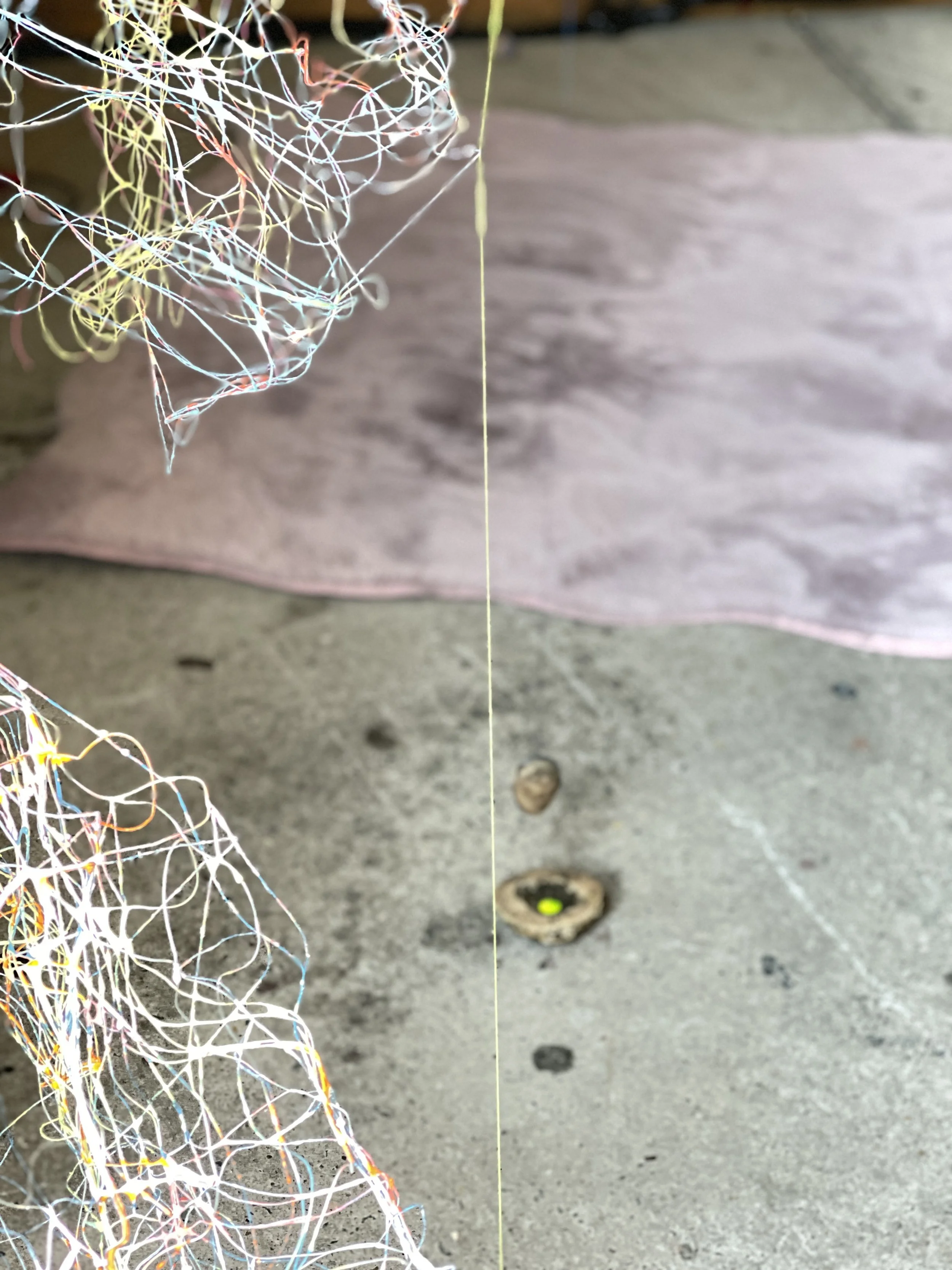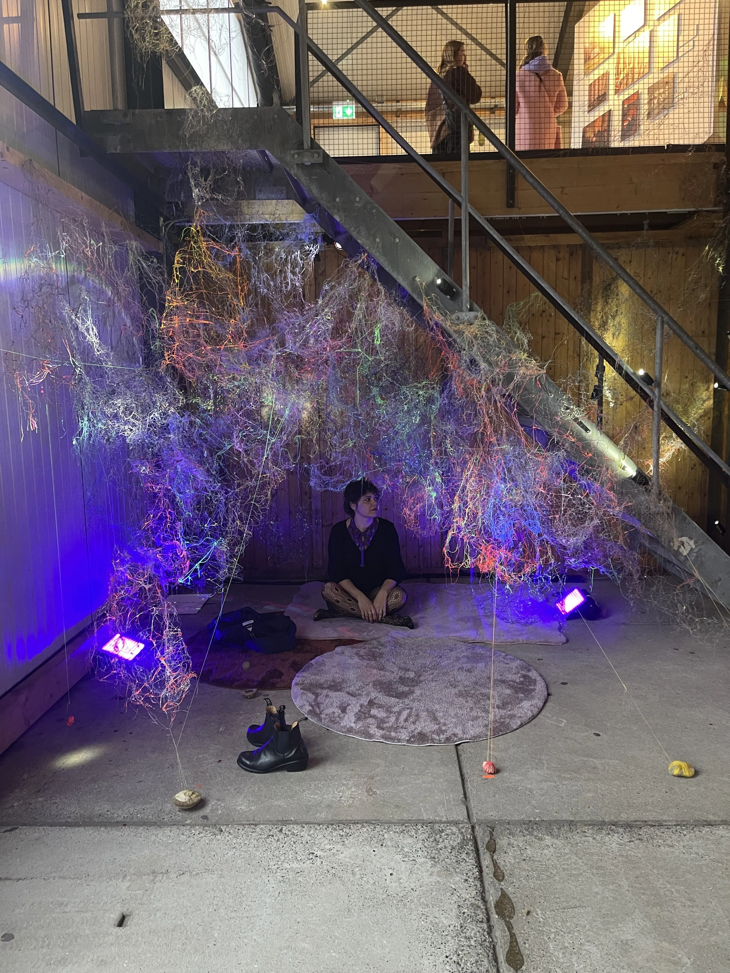 Since 2019, KAIROS has been growing into different shapes and sizes, although it is made of metal and textile thread, it seems to behave in an extremely organic way, it’s an expanding universe, a sort of industrial mycelium - it has a life of its own. For the exhibition Tongues , KAIROS #8 _NESTING will grow into a nest-like installation, the visitors are invited “to nestle” themselves within the cocoon, they are surrounded by a soundscape emanating from multiple small speakers, a loop of stories and memories creating a collective narrative. Home or HEIMAT is not only confined to physical spaces; it is a portable sanctuary within. It encapsulates the belief that one can carry this inner sanctuary anywhere, filling it with memories that transcend borders.